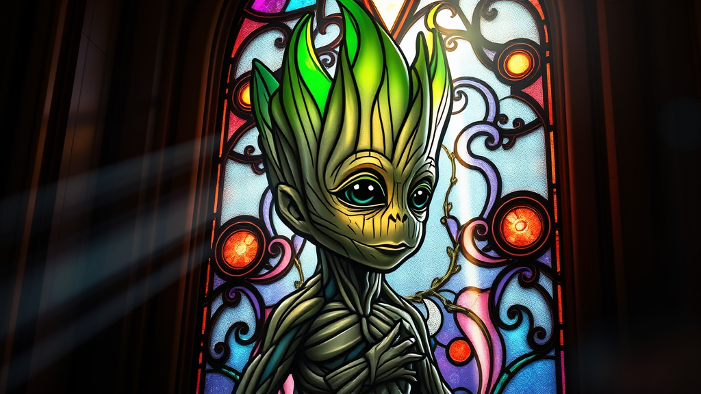 Stained glass window of baby Groot, intricate and vibrant, with a radiant glow, reminiscent of religious art, highly detailed in a gothic cathedral style. The scene is backlit, casting ethereal light, trending on Artstation; conceptual digital painting reminiscent of the imaginative styles of Clive Barker, H.R. Giger, and Brom. Featuring swirling colors and luminous highlights, the composition blends whimsical charm with dark fantasy elements.