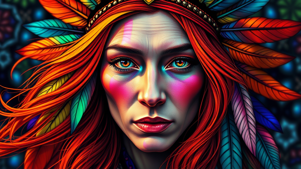 stained_glass, a highly psychedelic portrait of a North American Indian with colorful feathers in her hair, vibrant colors throughout, orange flowing hair, high detail, UHD, HDR, 8K, capturing a surreal and dreamlike atmosphere, abstract elements subtly merging natural forms, unique facial features, dynamic composition, artful symmetry, and imaginative distortions.