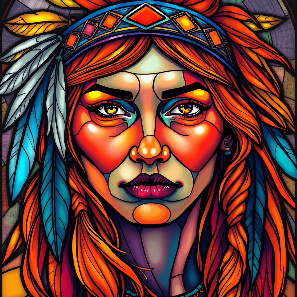 stained_glass, a highly psychedelic portrait of a North American Indian, adorned with feathers in her hair, featuring vibrantly colored skin and flowing orange hair, depicted in high detail, UHD, HDR, 8K resolution, avoiding any duplication or disfigurement, with harmonious and symmetrical features, maintaining realistic eyes and proportions, ensuring clarity and focus, free of low resolution and without any elements out of frame, eliminating blur, jpeg artifacts, watermarks, logos, letters, usernames, or words, avoiding cropped or cartoonish visuals, with a cohesive, well-drawn composition.