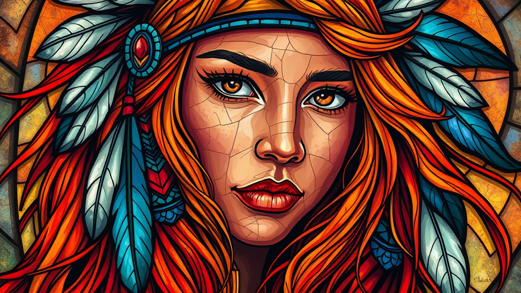 stained_glass, a painting of a highly psychedelic portrait of a Native American woman, adorned with feathers in her vibrantly colored hair, orange flowing locks, capturing high detail in an 8K UHD HDR setting, emphasizing psychedelic elements while infusing a touch of surrealism; the vivid portrayal highlights uniquely beautiful features and an aura of mystique, with a focus on artistic expression and the harmony of colors and textures that avoid conventional descriptors like clone effects or distortions; the artwork embraces elegance and cultural significance without resorting to a cluttered or fragmented appearance, ensuring clarity and cohesion throughout.