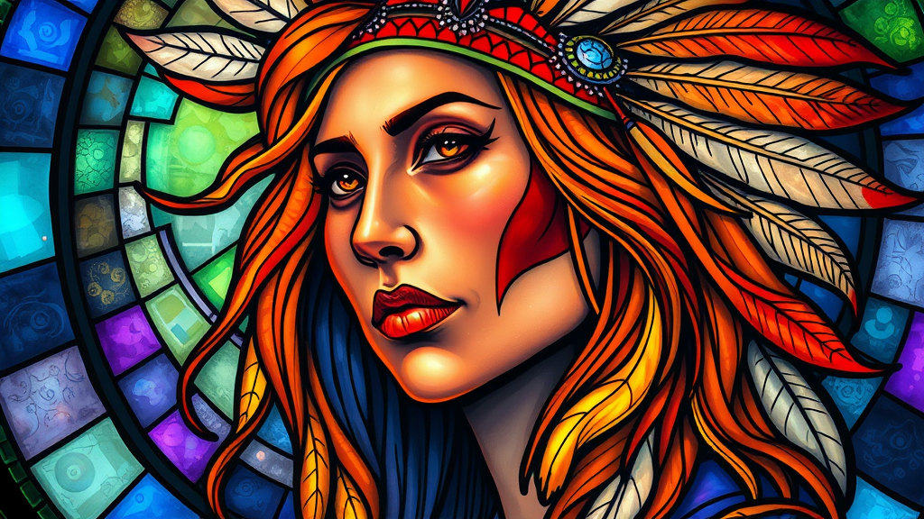 stained_glass, a painting of a psychedelic portrait of a North American Indian, with feathers in her hair, vibrant colors, orange flowing hair, high detail, UHD, HDR, 8K, highly detailed, unique expressions, full of personality, gracefully elongated neck, expressive eyes, artistic complexity, rich textures, intricate patterns, vivid contrasts, ethereal glow, harmonious balance, visually captivating, avoiding low resolution, clear focus, artistically refined, immersive composition, free of artifacts and distractions, seamless fusion of colors, fluid integration of elements.