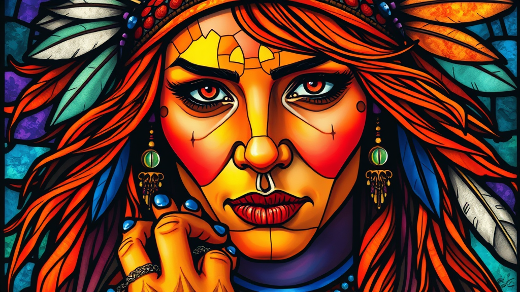 stained_glass, a vividly psychedelic portrait of a North American Indian, adorned with feathers in her hair, featuring vibrant colors, including orange flowing hair and richly hued skin. The image is high detail, UHD, HDR, 8K, showcasing a unique aesthetic while maintaining realism. It avoids duplication, disfigurement, or mutation, presenting a single, clear face with expressive eyes. The composition is well-proportioned, displaying realistic anatomy and elegant hands. Excludes low resolution elements, ensuring clarity and sharpness. The image is complete, focused, and free from any extraneous artifacts, such as watermarks, logos, or text.