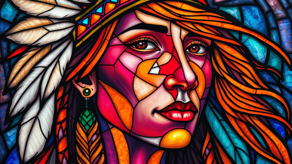 stained_glass painting of a psychedelic portrait of a North American Indian with feathers in her hair, vibrantly colored skin, and flowing orange hair; high detail, UHD, HDR, 8K; unique features and abstract elements, emphasizing vivid colors and intricate patterns; focus on creativity and artistic expression, with attention to facial features, ensuring harmony and balance within the composition.