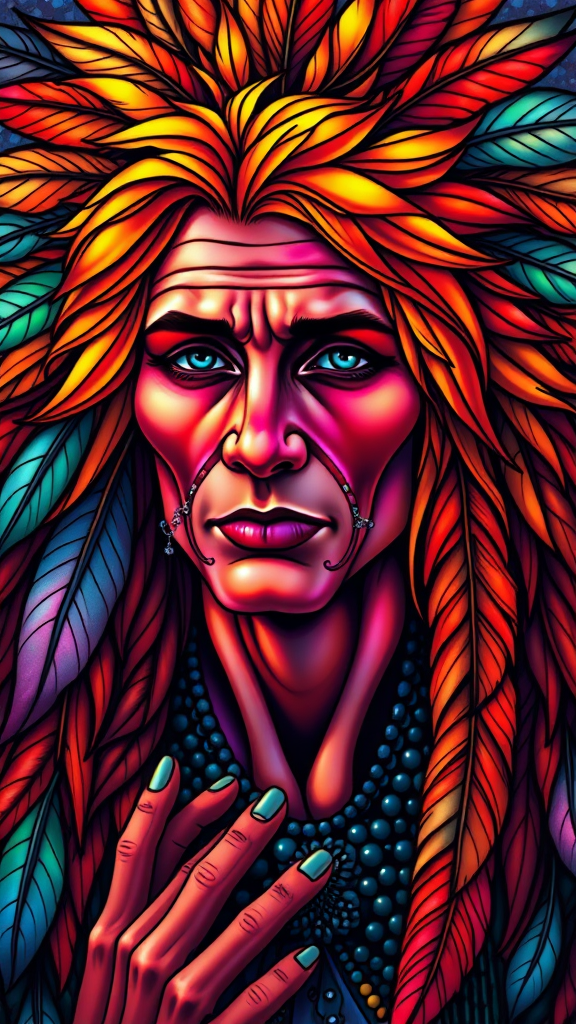 stained_glass, vibrant and psychedelic depiction of a North American Indian with flowing orange hair and feathers intricately woven in, radiant and diverse hues on skin, high detail, UHD, HDR, 8K, uniquely expressive, surreal elements, captivating gaze, elongated neck, distinctive hands, harmonious yet abstract, avoiding extraneous imperfections, clear frame, free of any distortions or artifacts, pure and seamless presentation.