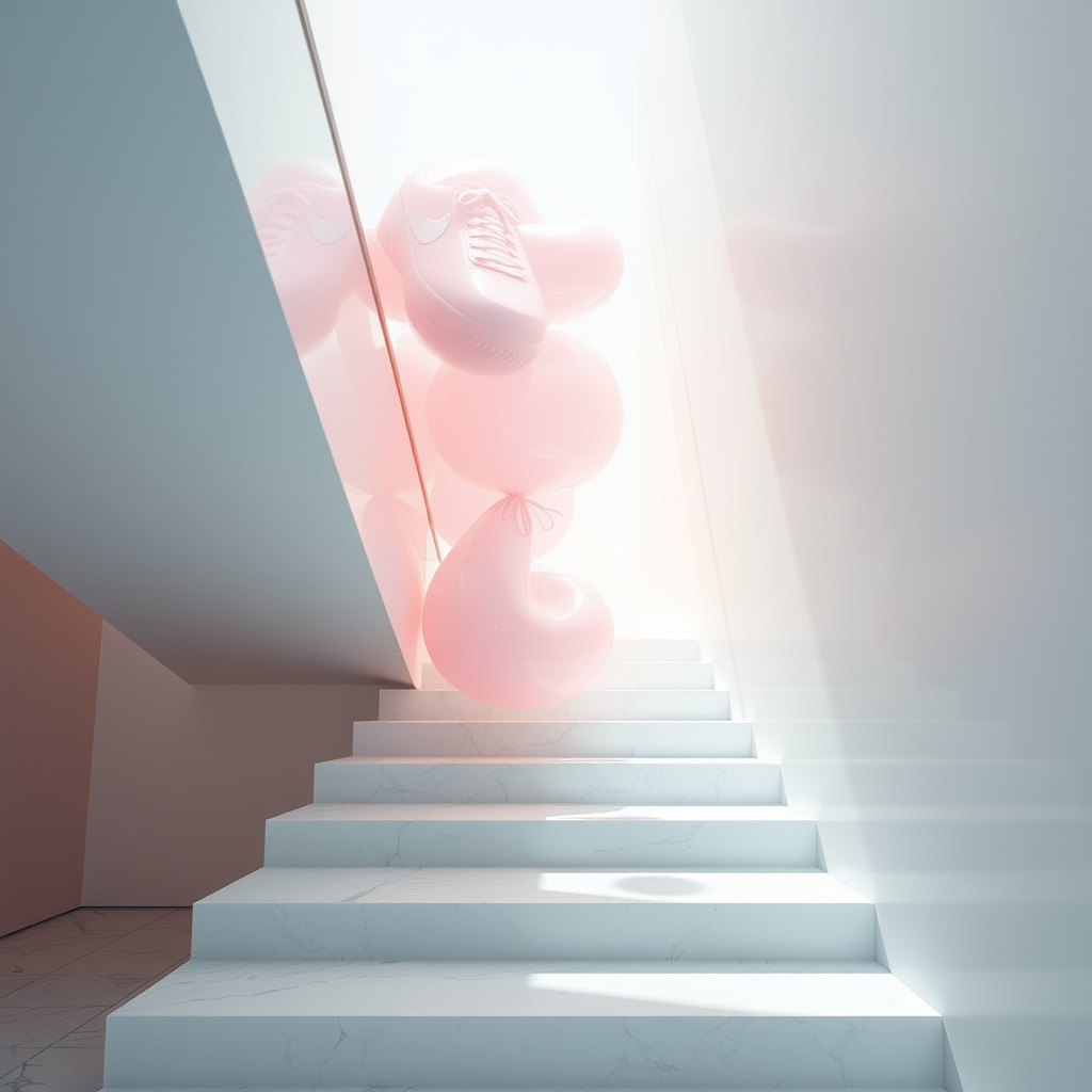 Staircase, Bubble Gum, Translucent Layers, Experimental Product Design, 3D Rendering, Octane Engine, Tranquil and Well-Contrasted, Floating in Air, Radiant, Nike Sneakers, --aspect-ratio 4:6 --style 1000 --quality 5 --randomness 27 --quality-level 2 --detail 750 --version 5