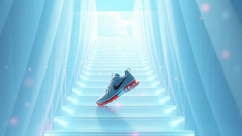 Stairway ascent, ethereal translucence, vibrant innovation, experimental design, sleek 3D rendering, Octane-powered, tranquil yet striking contrast, floating in atmosphere, luminous brilliance, Nike sneakers as centerpiece -- harmonious balance in design, creative chaos intertwined with serene clarity.