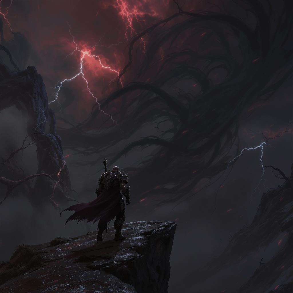 Standing at the precipice where destiny teeters, shadows intertwine as malevolent forces press close, the air crackling with tension under dramatic, otherworldly lighting in a 5D realm. The scene unfolds as if crafted in Unreal Engine, where reality blurs with dark fantasy, echoing the grim artistry of Diablo, every nuance suggesting an epic confrontation with the encroaching darkness.