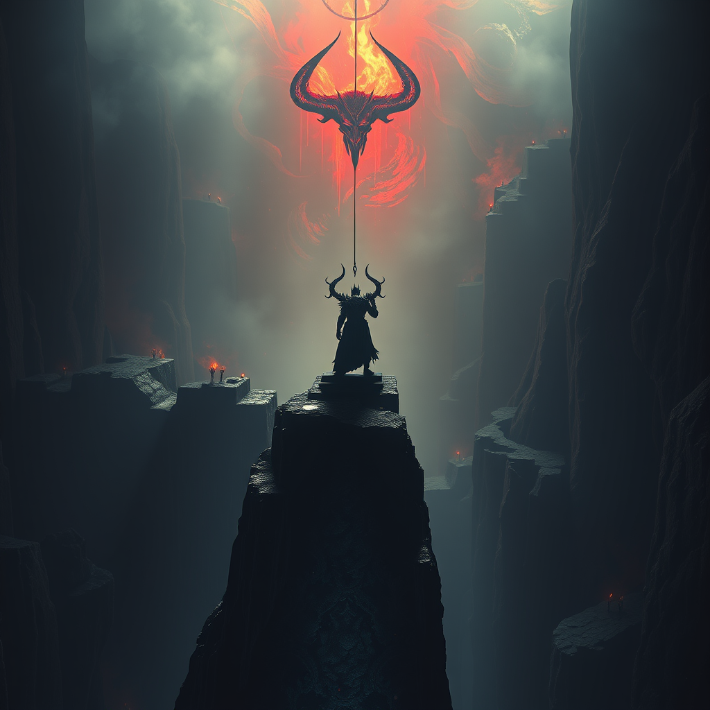 Standing at the precipice where fate hangs by a thread and the abyss awaits, shadows flicker ominously as the devil's relentless knocking echoes through the void. Bathing the scene in dramatic, otherworldly lighting, the 5D dimension unfolds in surreal splendor, rendered with the meticulous detail and dark fantasy style of Diablo.