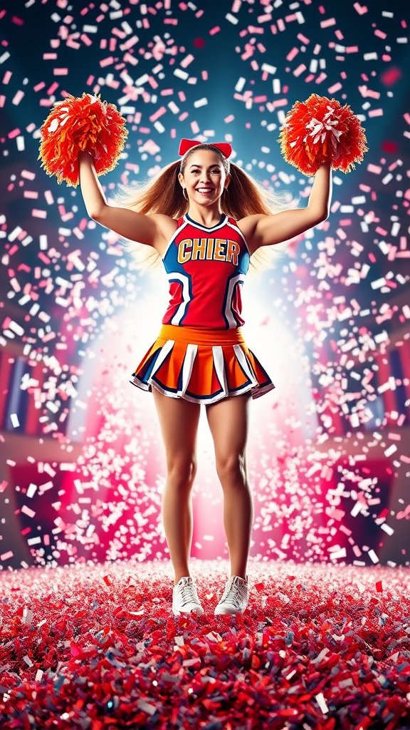 Standing confidently in a vibrant cheerleader outfit atop a cascade of shimmering confetti, she radiates energy and excitement, pom-poms aloft and ready to rally the crowd with her spirited enthusiasm.