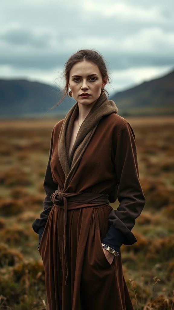 A woman standing gracefully in an expansive field, her attire meticulously styled for a stunning photo shoot, reminiscent of the captivating works of Daria Endresen and Kris Knight. Enveloped by the rugged beauty of Scottish landscapes, her clothing features the rich tones of light navy and deep brown, adding an earthy elegance to the scene. Subtle influences of Georg Jensen's craftsmanship are evident in her accessories, lending a touch of refined sophistication. The intense close-ups reveal her serene expression and poised demeanor, captured in a matte finish that enhances the tranquil mood.