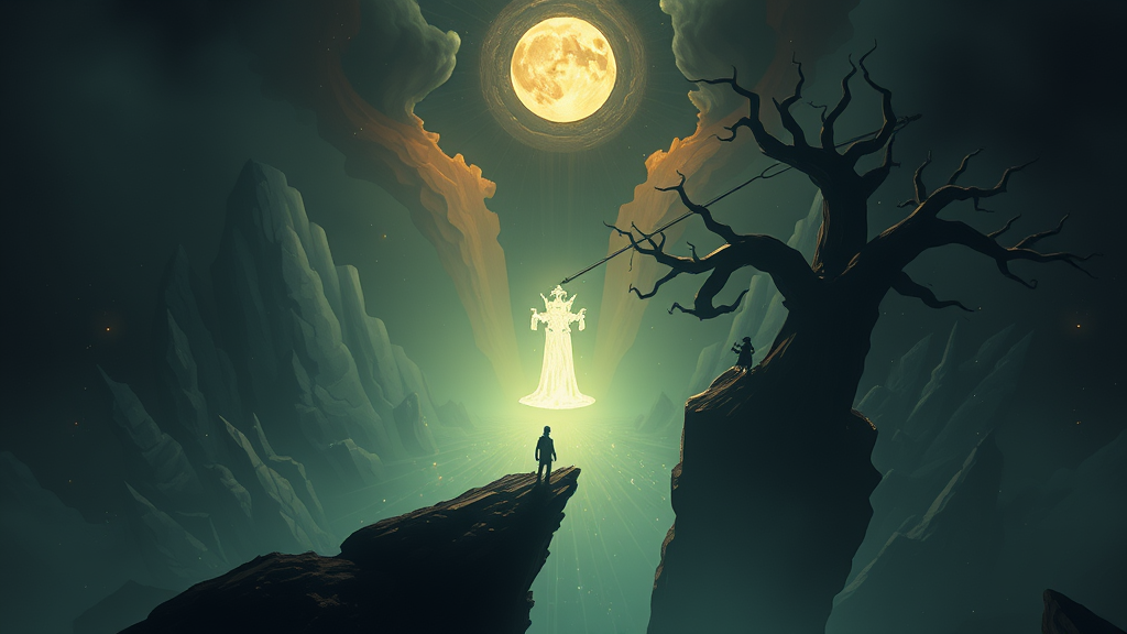 Standing on the precipice of destiny, the world teeters, a delicate balance as fate looms above while a sinister presence pounds at the barrier of reality. Bathed in dramatic, ethereal light, the scene unfolds within a surreal 5D dimension, powered by Unreal Engine. Echoing the whimsical darkness of "Don't Starve," this stunning concept captures the essence of Stanley Artgerm’s iconic style, with twisted landscapes and haunting figures merging in a dance of shadow and light, creating an atmosphere of imminent transformation and grasping suspense.