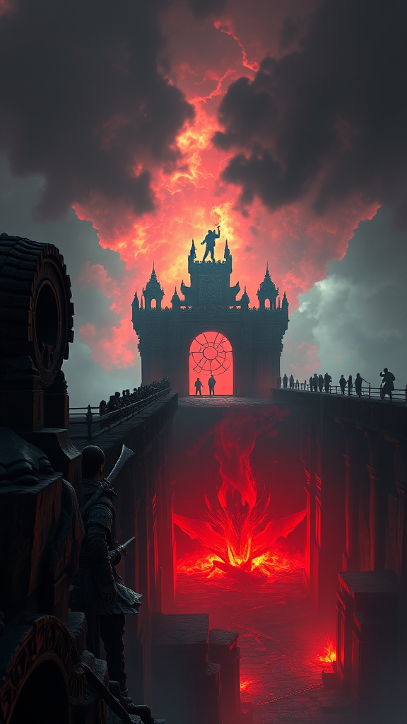 Standing on the precipice where destiny teeters and the abyss awaits, shadows dance in dramatic illumination with a 5D vibrancy as the infernal forces pound at the gates, rendered in vivid detail reminiscent of a Diablo-inspired world with the haunting realism of Unreal Engine.