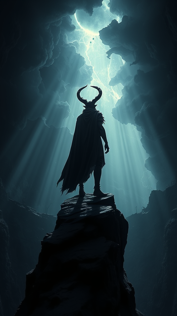 Standing on the precipice with destiny poised to descend, as shadows coil and the devil's whisper echoes in the void, dramatic chiaroscuro lighting illuminates the surreal 5D landscape. Crafted in the style of an eerie nightmare akin to Don't Starve, the scene unfolds in Unreal Engine, revealing a breathtaking tapestry of intrigue and danger. Brought to life by the visionary artistry of Stanley Artgerm, the concept art captures the surreal elegance of the unknown with a slightly twisted edge, merging reality and fantasy in a stunning, atmospheric composition.