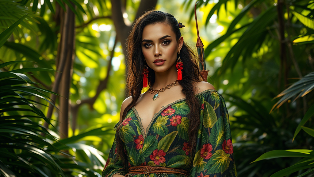 Standing proudly in a lush jungle setting, she is enveloped by vibrant foliage, her attire a masterpiece of leaf patterns adorned with intricate floral details. Nature-inspired accessories complement her look, as ambient sunlight filters gently through the canopy above, casting a serene glow. Her elegance exudes a warrior-like sophistication with a hint of sensuality, captured in cinematic 4k UHD resolution, embodying the essence of nature's untamed beauty.