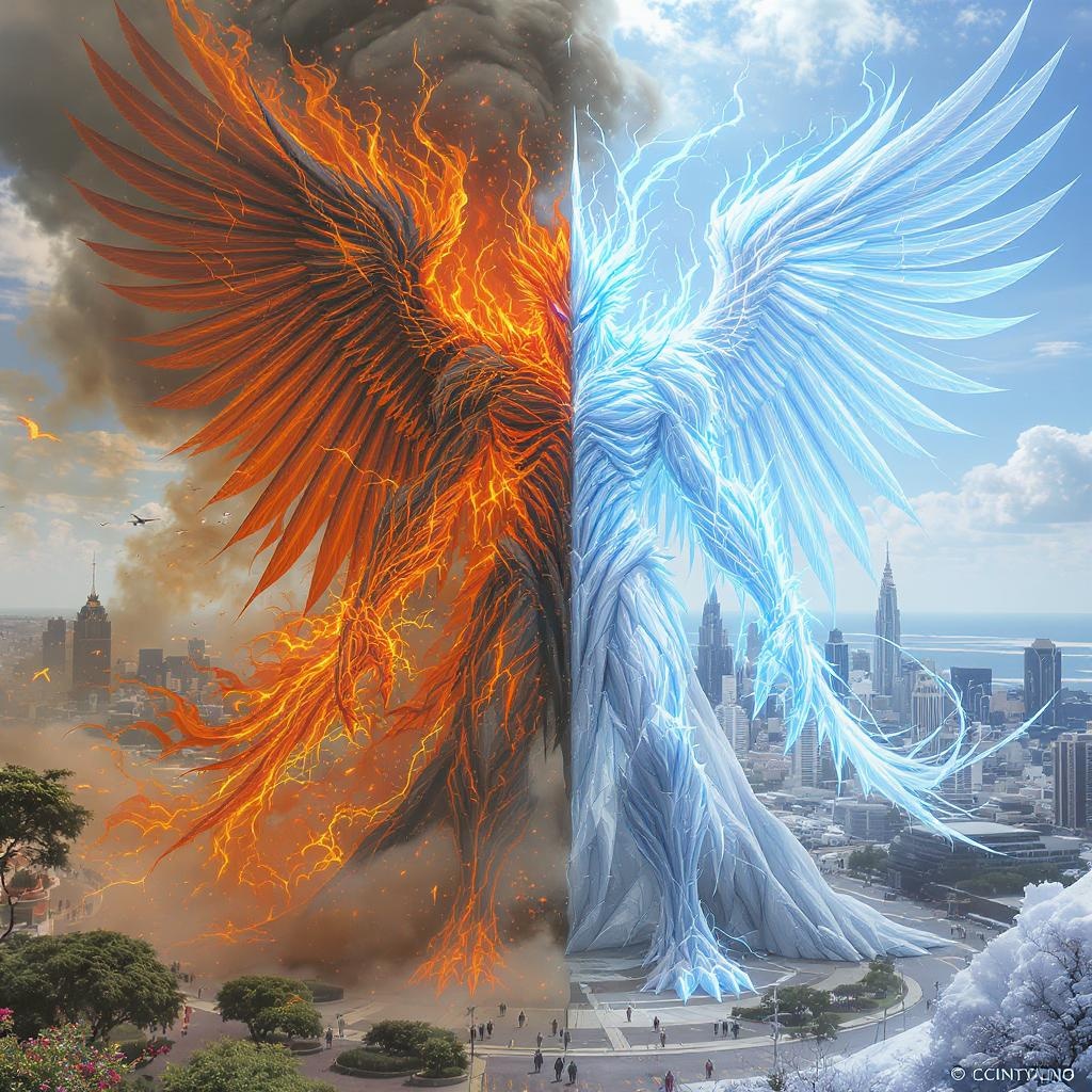 Standing tall amidst a city caught in a struggle between blazing fires and a frozen expanse, the elemental sentinel looms as a guardian of duality. With one fiery side engulfed in untamed flames and the other sheathed in crystalline ice, it represents both destruction and preservation. Its mighty wings stretch wide, half consumed by the wild blaze while the other glistens with a frosty sheen. Despite the chaos, human life continues below; people navigate bustling streets under clear weather and serene skies, their lives untouched by the elemental battle above. The city thrives with green landscapes and colorful flora, while in the distance, calm oceans shimmer under direct sunlight. Ordinary wildlife meanders through patches of untouched nature, and mundane city life buzzes on with functional technology and unaffected buildings. The asymmetrical distribution of elements across the sentinel's form echoes the equilibrium found within this realm of contrasts.