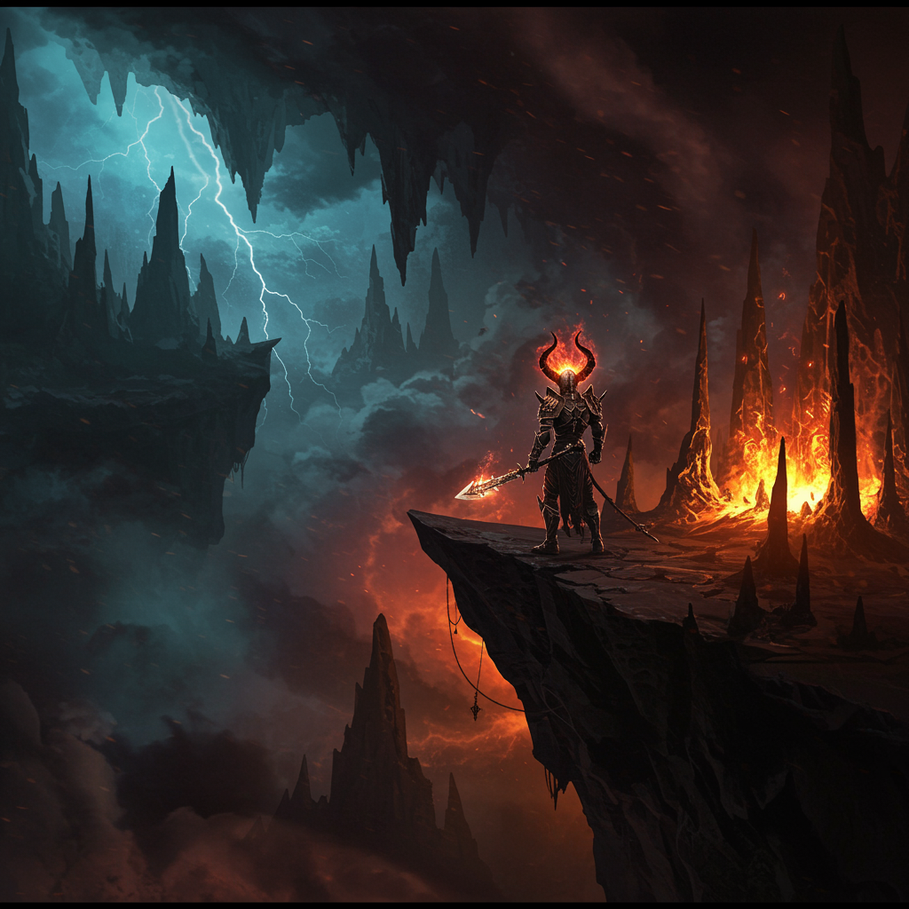 Standing on the precipice where the universe teeters and destiny hangs by a thread, the world around you pulsates with ethereal energy, as shadows dance to the rhythm of a relentless storm. In the heart of this 5D realm, where dimensions blur and reality bends, infernal light casts twisted silhouettes, painting the scene in dark, vivid strokes reminiscent of a Diablo legend brought to life with the power of Unreal Engine. As the atmosphere crackles with anticipation, the essence of chaos personified waits just beyond sight, its presence a chilling whisper on the razor's edge of the void.