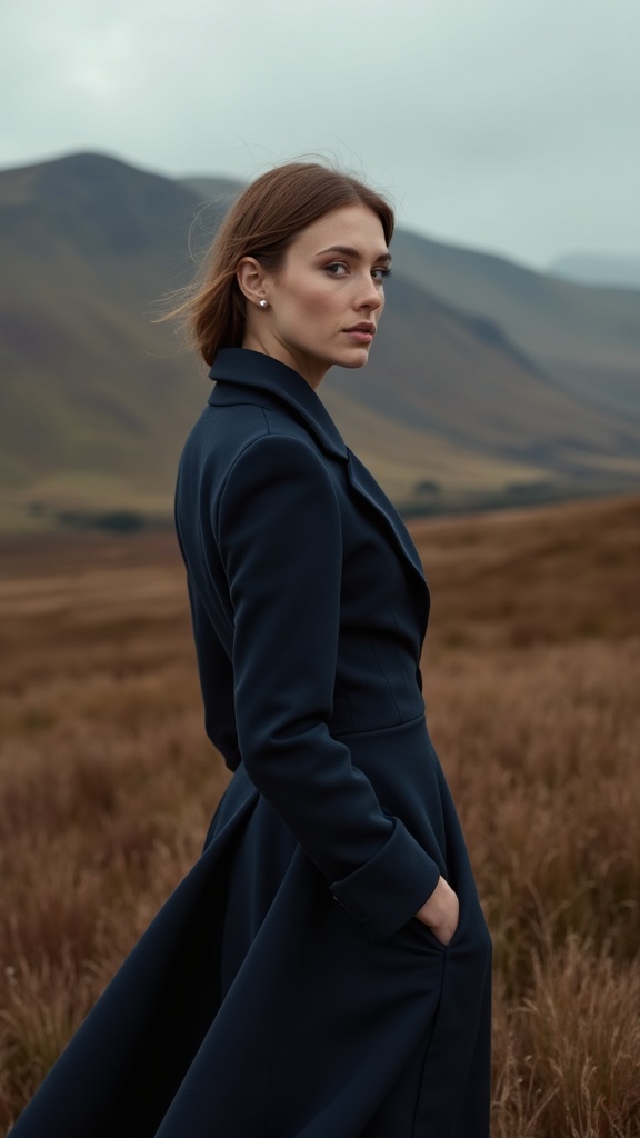 A woman stands elegantly in a Scottish field, her attire curated for the camera's gaze, evoking the ethereal style of Daria Endresen and Kris Knight. The landscape is a tapestry of rolling hills, captured in deep navy and rich brown tones that echo the brooding beauty of the Highlands. Her ensemble features the sleek, modern lines of Georg Jensen design, contrasting with the organic backdrop. The camera captures her in intense close-up, emphasizing the matte texture of the photograph, offering a striking juxtaposition between the refined elegance of urban sophistication and the raw majesty of nature.