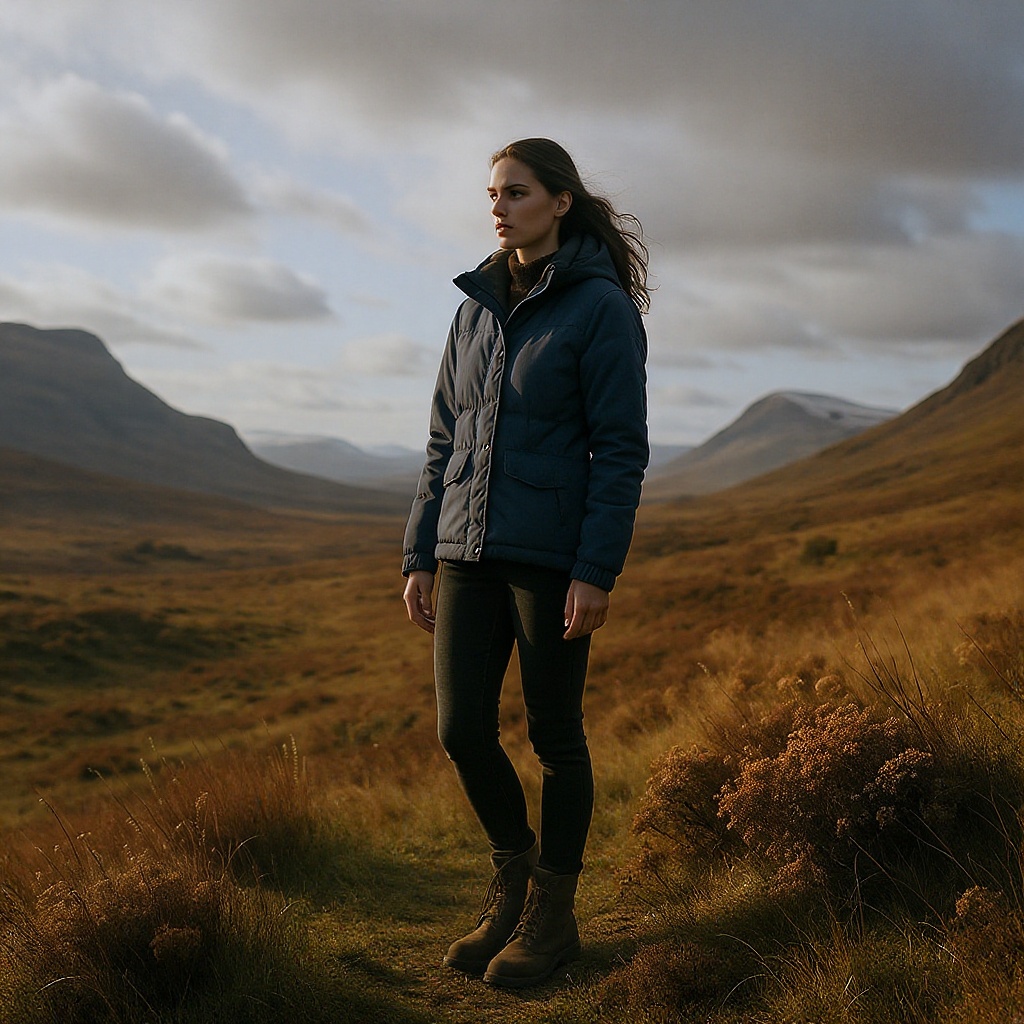 View this AI-generated image featuring a woman stands gracefully in a vast scottish landscape the rolling hills and dramatic skies providing a breathtaking backdrop she is styled in outdoor fashion wearing a light navy jacket and dark brown boots that complement the earthy tones of the scene the nat