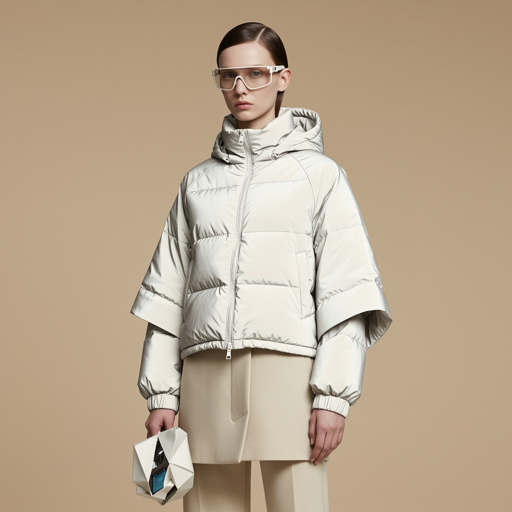 The woman in the photograph stands poised against a neutral beige backdrop, embodying the essence of a Tumblr icon with her striking attire. She wears a sleek, reflective puffer jacket paired with a chic poncho, both garments rendered in an elegant off-white palette. Her ensemble subtly nods to an internet meme or trend, gaining traction on the design and architecture platform Dezeen. Captured as if from a future fashion catalog, the image highlights emerging styles for 2024. Her accessories include a contemporary tech device, a distinctive pair of 8.0 LV sunglasses, and an artfully folded piece by designers Mike and Wojtek Fus. This avant-garde outfit encapsulates the forefront of fashion innovation, promising to captivate attention and set trends.