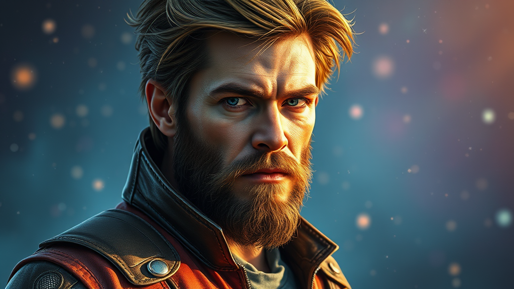 Star-Lord from Guardians of the Galaxy, captured in an extraordinary hyper-realistic and hyper-detailed epic portrait, showcases the iconic Marvel character in dynamic, rich cinematic color grading. The scene is stunningly photorealistic, resembling an intricate photograph taken in 8k resolution with a Canon EOS-1D X Mark III. This photorealistic painting captures the captivating essence of Star-Lord with exceptional detail and clarity, as if taken in the soft morning light. The camera settings are carefully chosen to emphasize this serene illumination, with a cinematic 35mm lens, inspired by the distinctive styles of artists like James Jean and Jean-Honore Fragonard. This portrayal of Star-Lord offers subtle creative modifications while maintaining the core concept of a heroic space adventurer, evoking a sense of wonder and adventure.