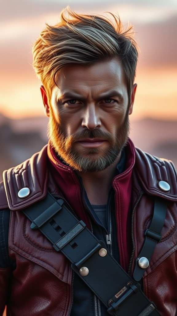 Star-Lord from Guardians of the Galaxy, portrayed as a hyper-realistic and epic portrait, captures the essence of a Marvel hero with intricate details and cinematic flair. The scene uses rich, vibrant color grading to highlight the character’s dynamic energy, set against the backdrop of a soft morning light that bathes the subject in a warm, gentle glow, reminiscent of the style of James Jean and Jean-Honoré Fragonard. Photographed with the Canon EOS-1D X Mark III, the image is stunningly photorealistic, showcasing exceptional clarity and detail at 8k resolution. The 35mm cinematic lens captures the epic intricacies of Star-Lord's expression and attire, creatively modified to infuse a sense of classical elegance and heroic presence, while still preserving the iconic elements that define the legendary character.