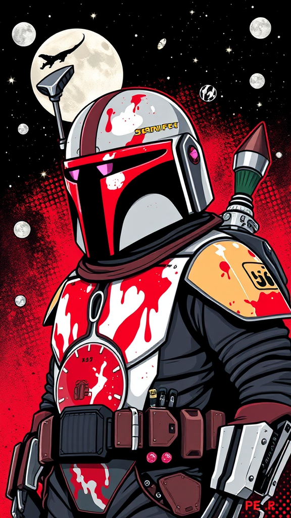 star wars boba fett by chris phu 1 in a graffiti-influenced style with a cartoonish humor twist, featuring silver accents, ragecore intensity, and elements of caninecore. Infuse celestialpunk vibes with a dark white and red color scheme, creating an otherworldly scene. Include subtle cosmic motifs to enhance the celestial theme.