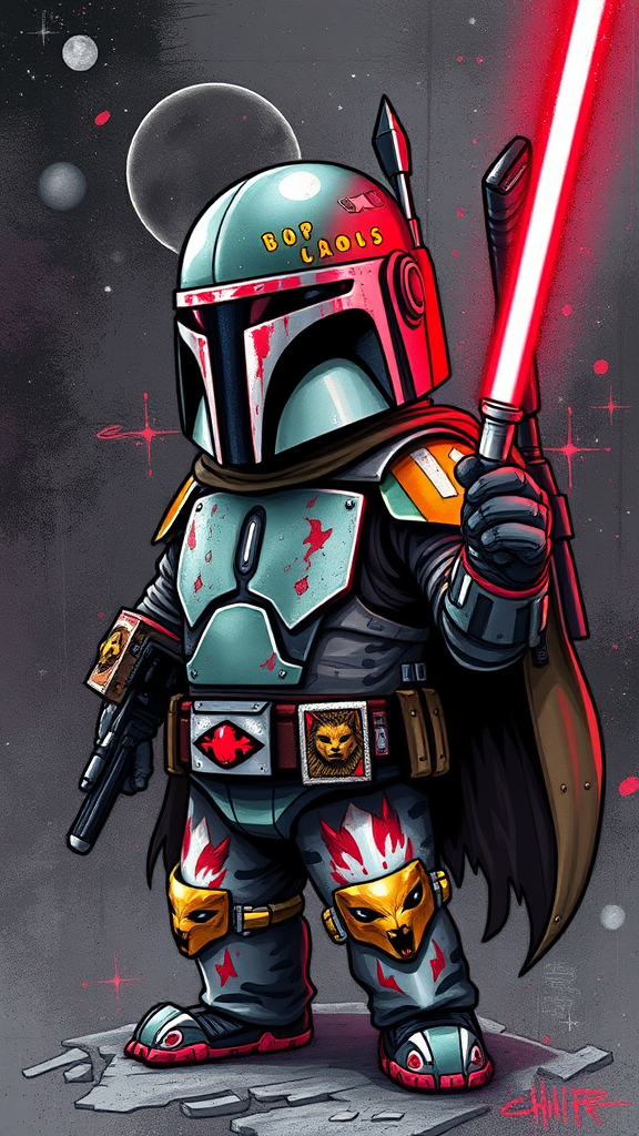 star wars boba fett by chris phu 1, infused with graffiti-inspired flair, cartoonish whimsy, metallic sheen, intense energy, canine motifs, cosmic fantasy, dark white and crimson hues, incorporating celestial elements and edgy design, --ar 90:127 --niji 5 --s 750