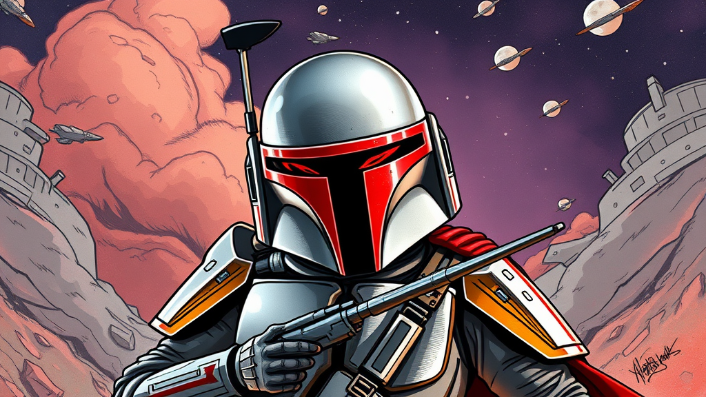 star wars boba fett by chris phu, graffiti-influenced style with cartoonish humor, metallic silver, infused with ragecore intensity, hints of caninecore elements, celestialpunk vibes, dark white and vibrant red accents, set in a dynamic scene. Incorporate exaggerated features with a playful yet edgy touch, maintaining an otherworldly and rebellious aura. Aspect ratio 90:127, niji 5, s 750.