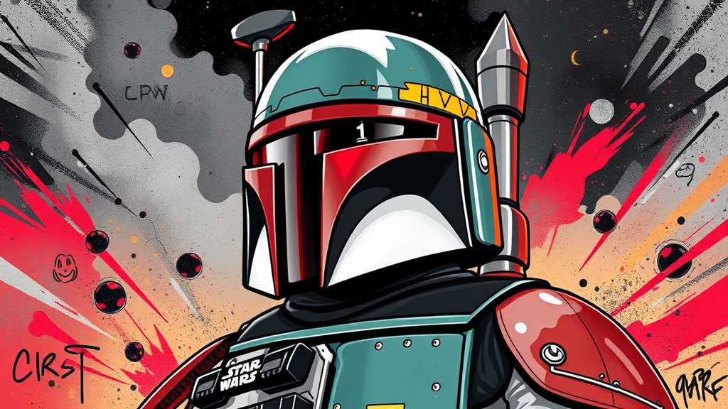 Star Wars Boba Fett by Chris Phu, in a vibrant graffiti-influenced style, with cartoonish humor, metallic silver tones, a touch of ragecore intensity, infused with caninecore elements, a celestialpunk atmosphere, and highlighting dark white and deep red colors. The artwork balances chaotic energy with playful details, creating a vivid and imaginative portrayal of the iconic character.