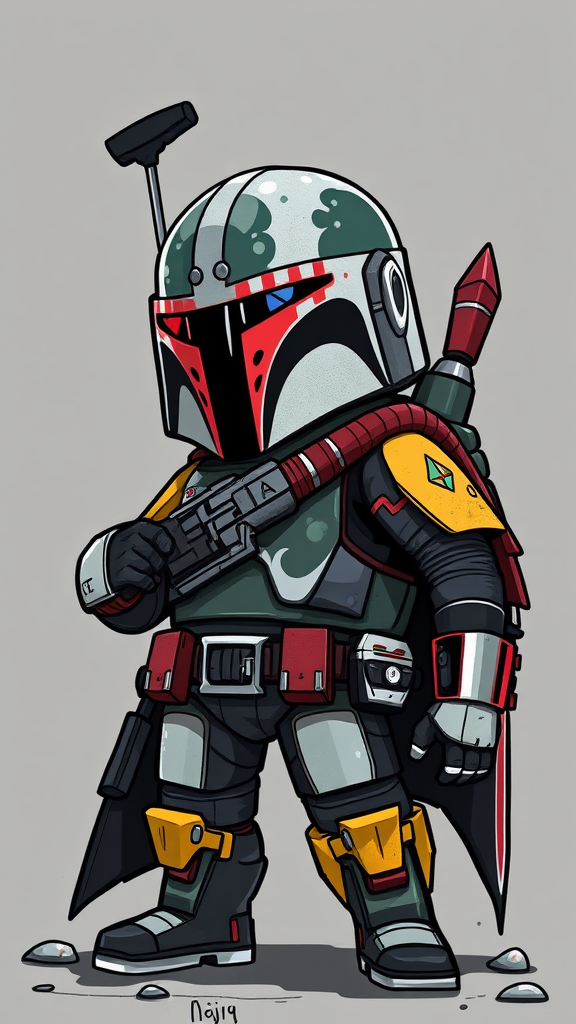 star wars boba fett inspired by chris phu 1, graffiti-infused style with cartoonish humor, metallic silver tones, infused with ragecore intensity, blended with playful caninecore elements, celestialpunk themes, primarily dark accents with white and red highlights, aspect ratio 90:127, niji 5 style influence, complexity level at 750