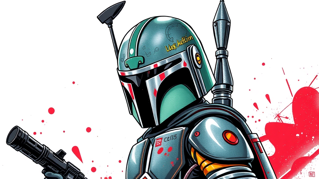 star wars bounty hunter boba fett by chris phu 1, illustrated in a graffiti-influenced style infused with cartoonish humor, shimmering silver tones, ragecore intensity, caninecore elements, celestialpunk motifs, with a dark white background and striking red accents, maintaining an aspect ratio of 90:127, stylized with a niji 5 touch and a surreal edge of s 750