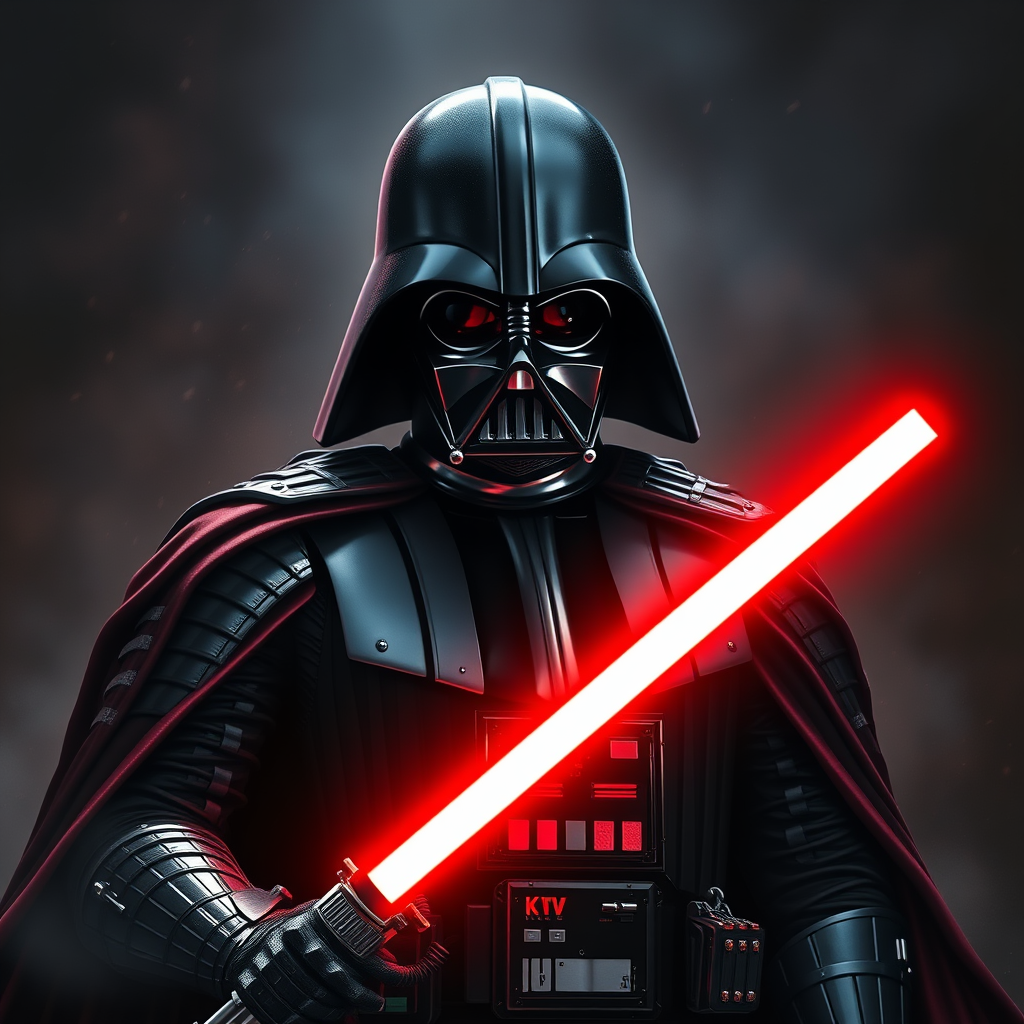 Star Wars Darth Vader in detailed obsidian and crimson samurai armor with cinematic shadows and illuminated by the glow of a menacing lightsaber amid a mysterious and dark atmosphere.