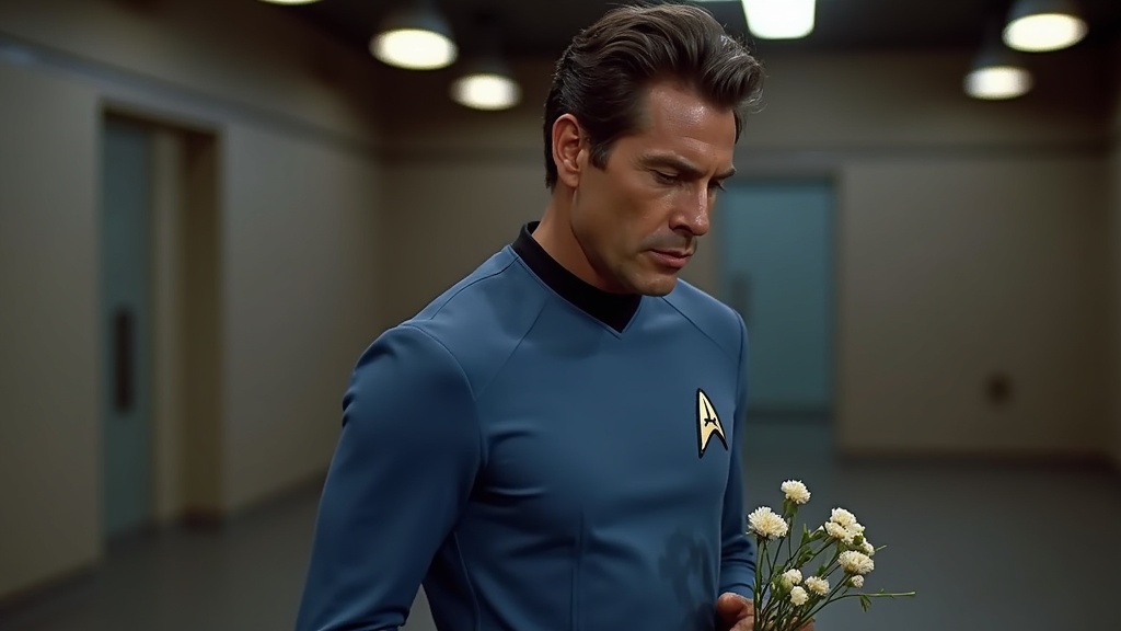A distinguished Starfleet officer, reminiscent of Dr. Leonard McCoy, stands pensively in a dimly lit cargo bay. He holds a small bouquet of white flowers, conveying a somber and reflective mood in this sci-fi setting.