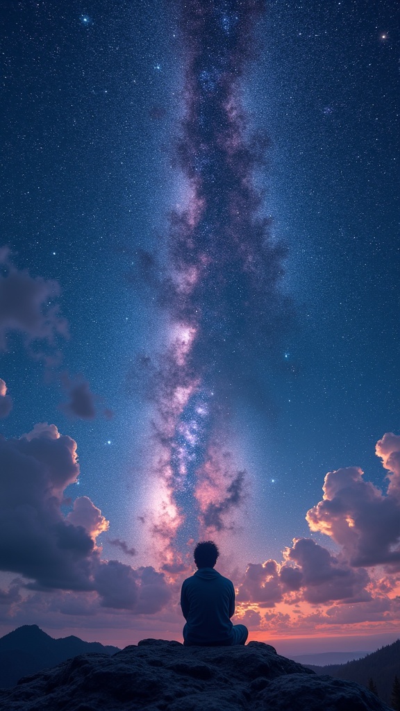 View this AI-generated image featuring staring at the starry sky immersed in wonder and introspection boundless universe ethereal glow of swirling hues centrally focused intricately defined awe inspiring splendor meticulous linework vivid and dynamic epic cinematic style inspired by kelly mckernan 8