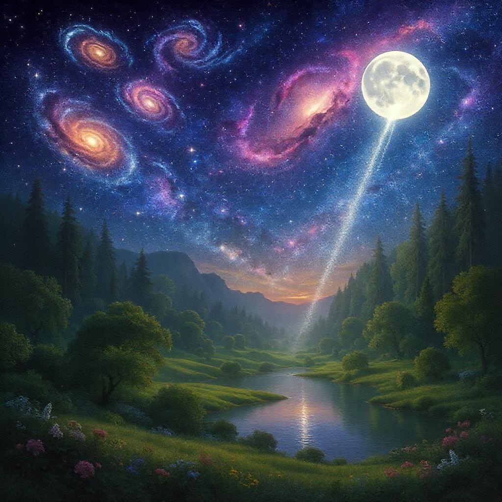 Starry sky tapestry blending celestial elements and lush landscapes, where galaxies swirl among vibrant forests and nebulae illuminate rolling meadows, as silvery moonbeams cascade over tranquil lakes nestled within cosmic gardens.