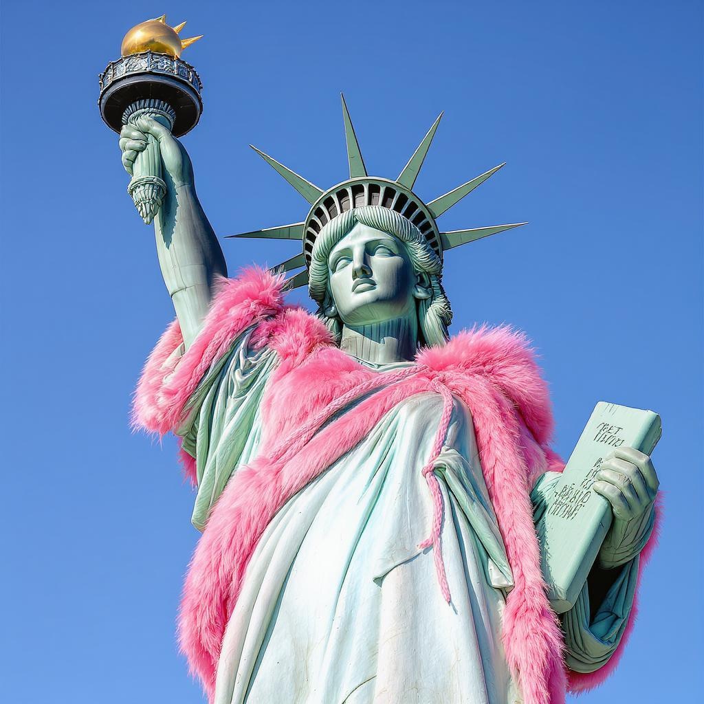 Statue of Liberty adorned in a luxurious pink faux fur coat, impeccably detailed with an ultra-realistic 8k octane rendering. Captured in high-resolution photography, the image showcases hyperrealism and professional color grading, enhanced with rich details and textures. The scene is set against a clear blue sky, capturing the iconic monument in a new, vibrant light while maintaining its majestic presence.