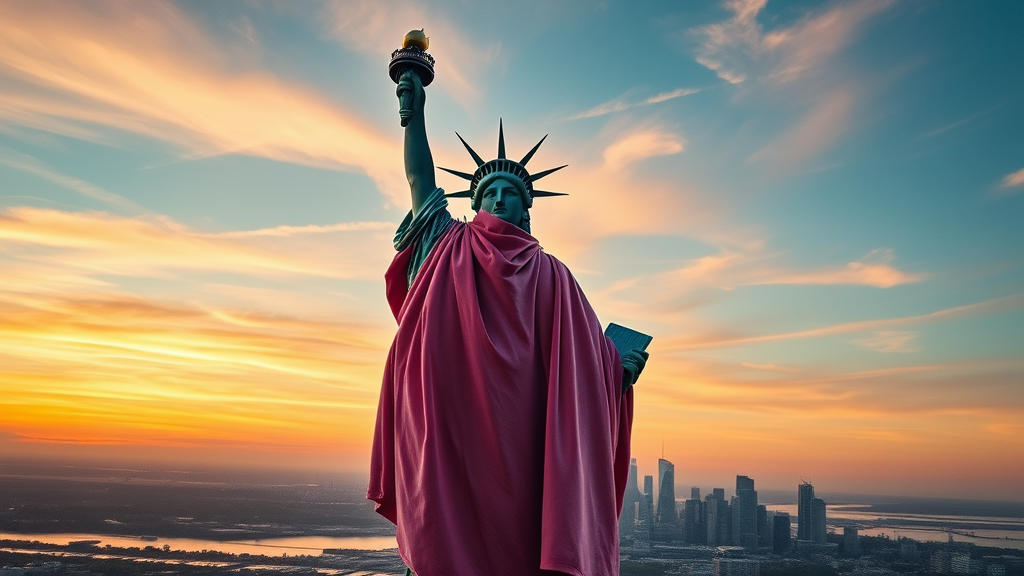 Statue of Liberty draped in a luxurious pink velvet coat, aerial drone shot, 8k octane rendering, breathtaking high resolution photography, hyperrealism, meticulously detailed, 8k clarity, ultra realistic, professional commercial photography, expertly graded colors, set against a vibrant sunset backdrop, with a soft breeze subtly lifting the coat’s edges in a graceful motion, aspect ratio 4:5.