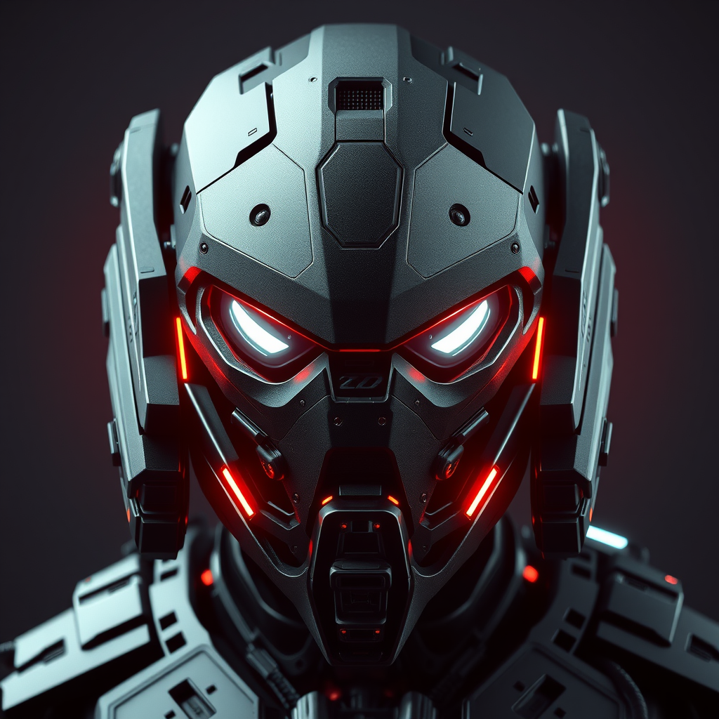 Stealthy military assault robot with a dark cyberpunk aesthetic, featuring futuristic design elements and sleek LED lights. The character showcases an aggressive and symmetrical design, with hard surfaces and a highly detailed face. The intricate details emphasize smooth lines and balanced proportions. Volumetric and ambient lighting create a warm, real-time visual atmosphere, enhanced with VFX for a digital 3D experience in UHD and HDR. Unique asymmetrical features like exposed mouth and ear structures are subtly incorporated. The robot's form avoids unnatural or distorted proportions, focusing on a fluid, symmetrical silhouette.