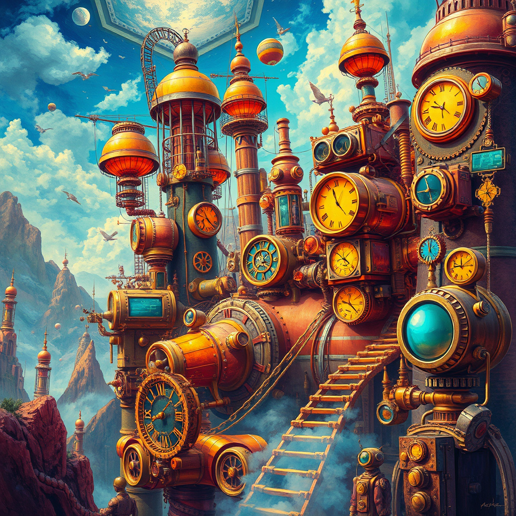 Steampunk adventure, vivid imagination, high saturation, vibrant palette, intricate designs, whimsical machinery, clockwork landscapes