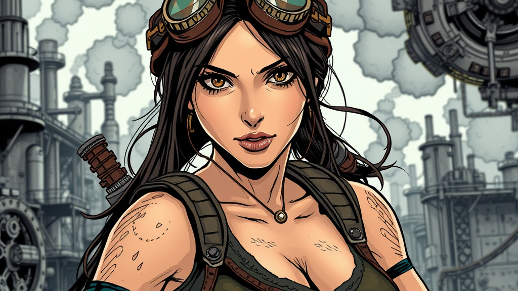 Steampunk depiction of Lara Croft in a highly detailed comic style reminiscent of Jim Lee, incorporating elements of 3D, cartoon, and anime aesthetics. The portrait showcases her in a dynamic pose, adorned in intricate steampunk attire with gears and goggles, set against a backdrop of an industrial landscape. Emphasize her adventurous spirit and iconic characteristics while infusing a touch of playful animation, sketch-like details, and vibrant colors, maintaining the essence of adventure and exploration.
