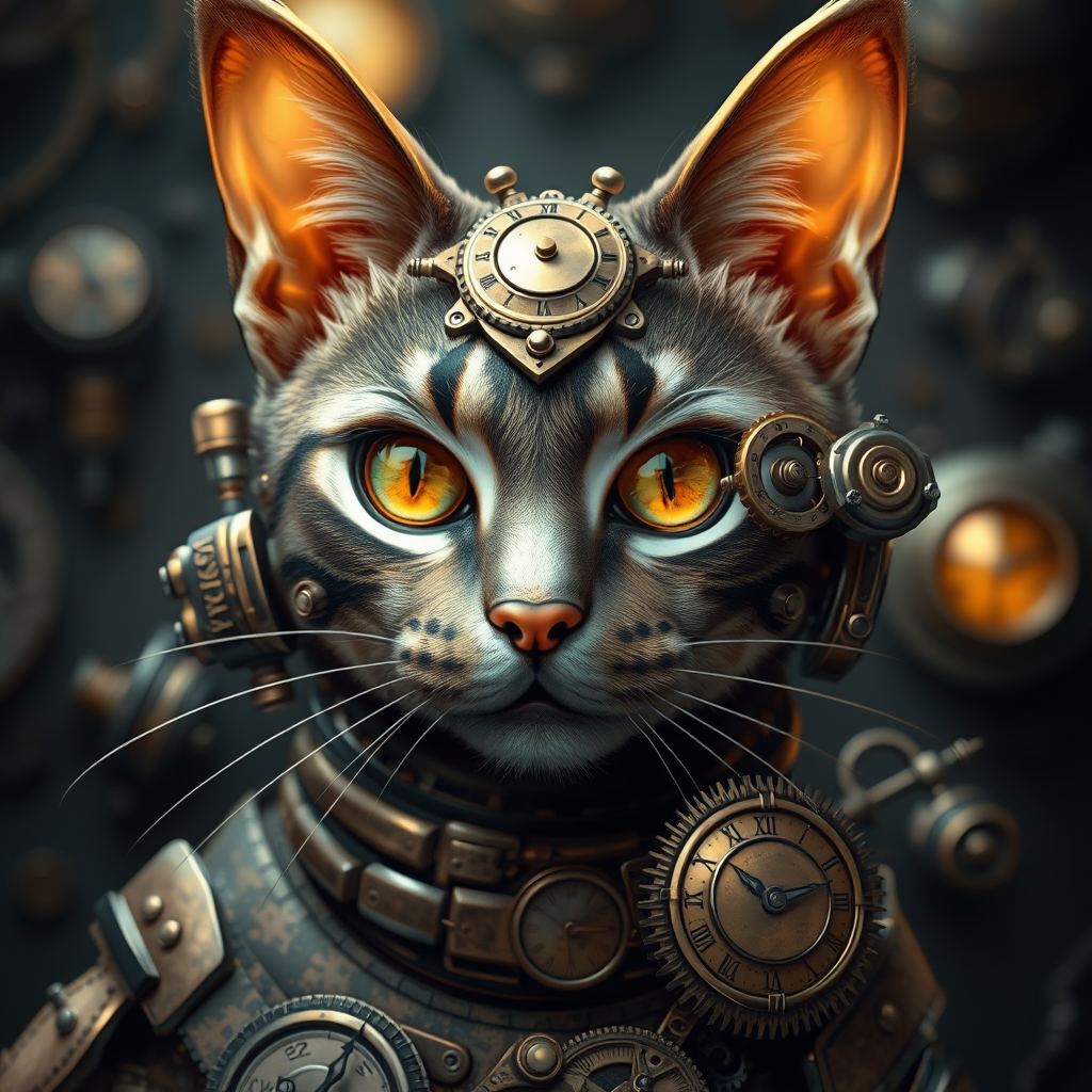 Steampunk feline, intricate clockwork details, highly realistic artistry, atmospheric lighting, rich textures, vintage mechanical elements, portrait orientation, exceptional detail and depth, imaginative and whimsical flair, vivid polished metal finish.