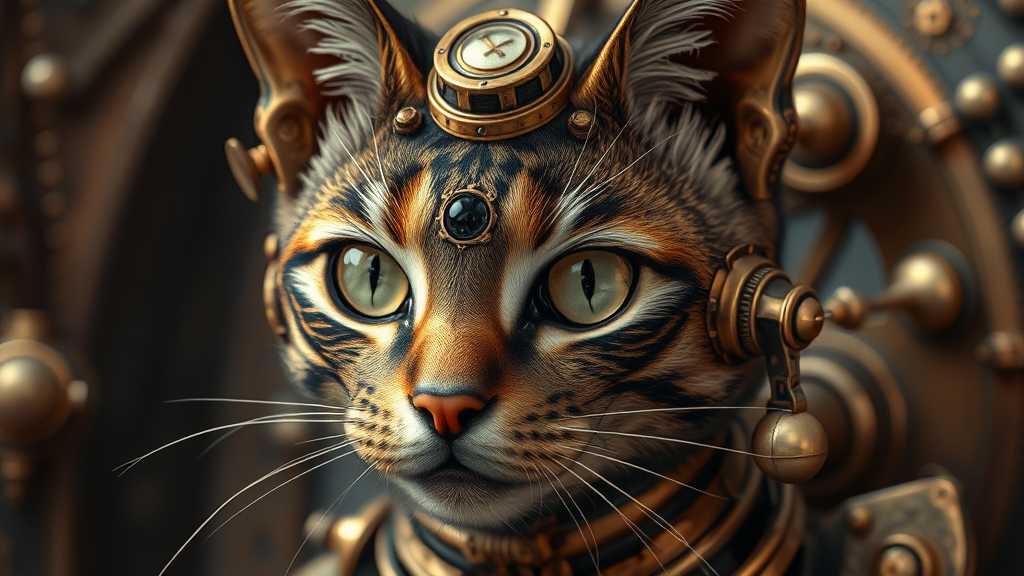 steampunk feline, ultra-realistic, intricately detailed, metallic gears and gadgets, rich copper and brass tones, surreal yet lifelike, enigmatic eyes, atmospheric lighting, lush textures, 2:3 aspect ratio, enhanced quality and depth, imaginative twist on Victorian technology