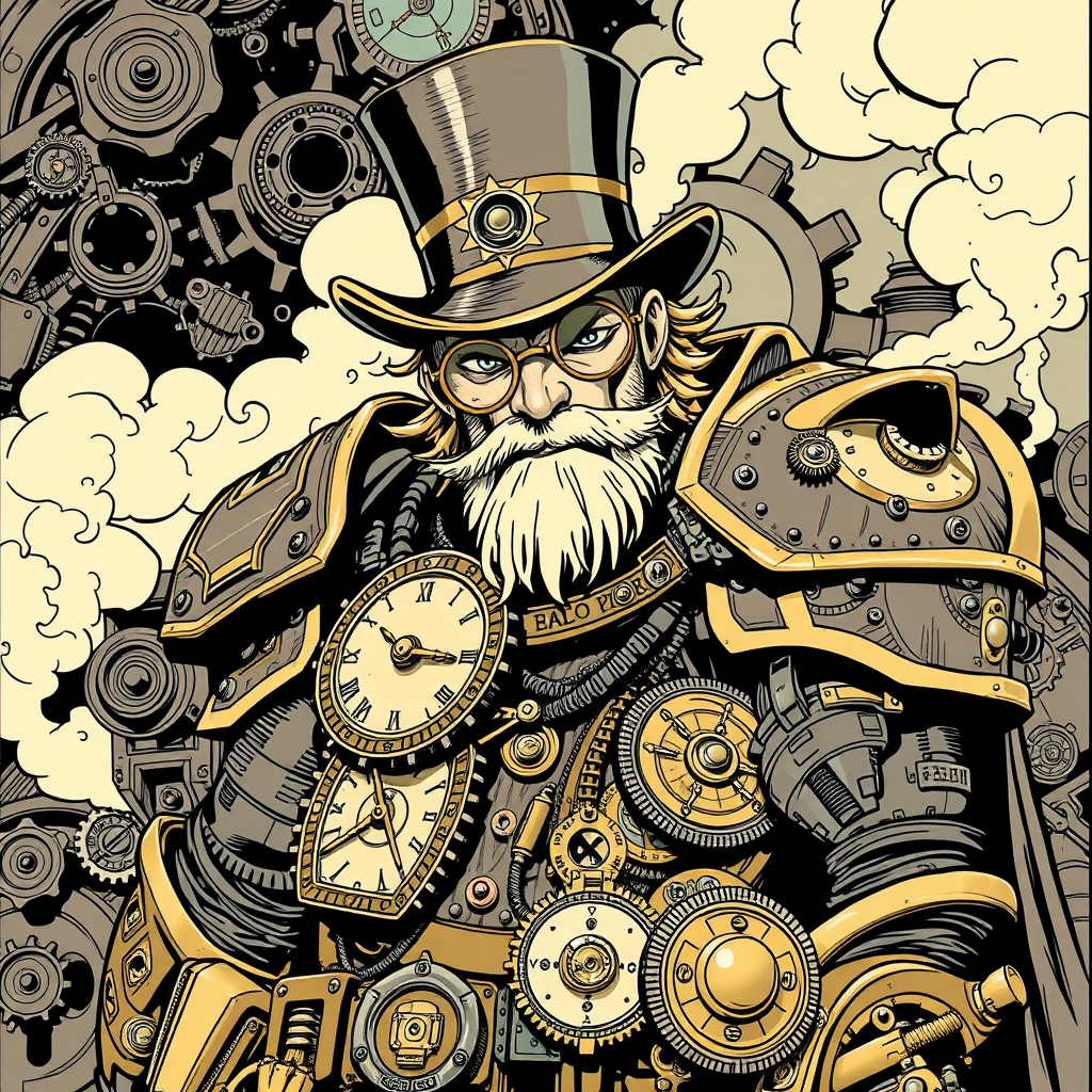 Steampunk illustration of a hero with intricate clockwork armor, wearing a brass monocle and a mechanical top hat, standing amidst a backdrop of gears and steam, with dynamic shading and bold linework reminiscent of Jim Lee's comic style, capturing a sense of adventure and innovation.