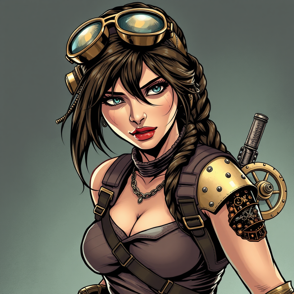 Steampunk illustration of Lara Croft, intricately detailed, comic book aesthetic, reminiscent of Jim Leeβs style, featuring brass gears and Victorian attire, rugged explorer stance, rich color palette with metallic sheen, adventurous expression, classic goggles perched on her head.