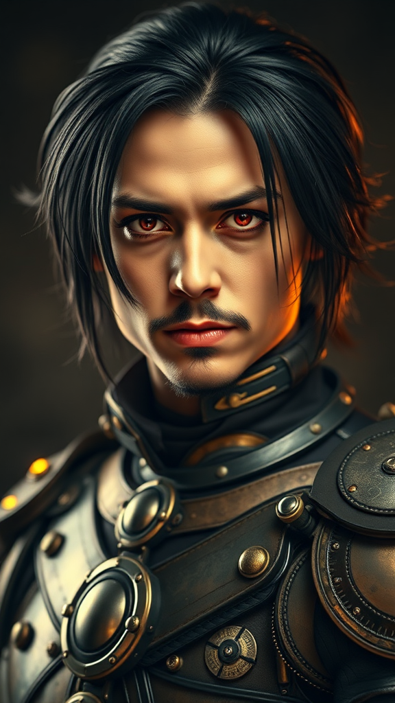 Steampunk-inspired character with striking red eyes and sleek black hair reminiscent of Johnny Depp, featuring a symmetrical face and adorned in detailed steampunk armor. The scene is captured in ultra HD and 8k resolution with dramatic, cinematic studio lighting that illuminates the figure. The portrait showcases a full-body view, emphasizing the intricate design of the armor. The character stands confidently, exuding a mysterious aura. Avoiding any visual distortions or imperfections, the composition focuses on impeccable anatomy and proportions, ensuring clarity and high-quality representation. The overall atmosphere blends a sense of adventure with the elegance of the steampunk aesthetic.