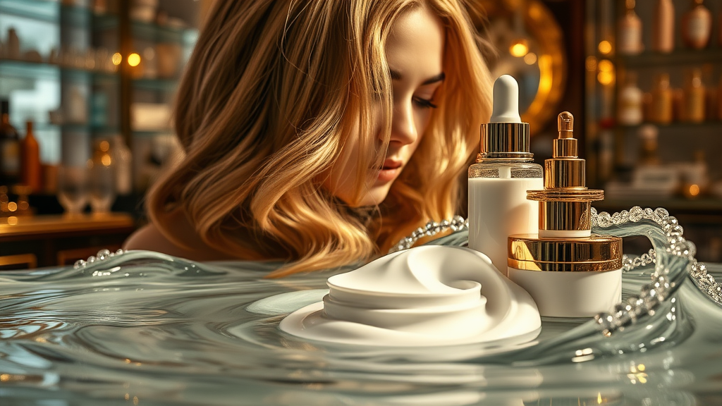 Steampunk-inspired face serum and cosmetics display, featuring face cream and hair care products in a highly detailed oktane render. Studio lighting highlights the luxurious textures of cream immersed in swirling water. Set within a vintage cosmetics store, the scene captures the essence of body care with an emphasis on radiant, beautiful hair and golden accents throughout.