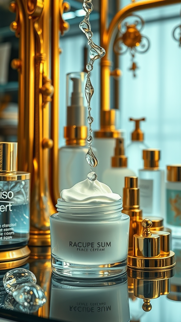 Steampunk-inspired face serum and cosmetics display, featuring a highly detailed scene with face cream suspended in water, illuminated by studio lighting. Imagine a luxurious cosmetics store setting where body and hair care products are showcased, emphasizing the beauty of radiant skin and lustrous hair. The composition highlights shimmering gold accents and intricate details, creating an elegant and timeless atmosphere, reminiscent of a fusion between classic and futuristic aesthetics.