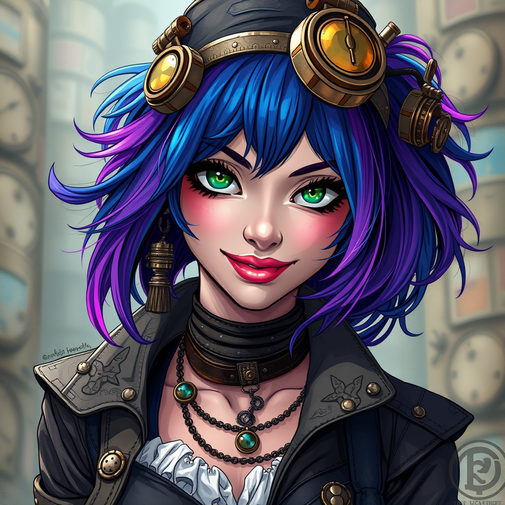 Steampunk-inspired female rebel with striking blue and purple hair and captivating green eyes, sporting a cheeky smile. She stands confidently at the center of the scene, displaying an intricate and highly detailed wardrobe. Her breathtaking beauty is accentuated by precise lineart and vibrant colors, capturing a comprehensive cinematic essence reminiscent of artists Carne Griffiths and Conrad Roset. The image boasts an 8k resolution, showcasing her expressive features and detailed attire. Despite minor imperfections such as subtle jpeg artifacts, the focus remains on her rebellious charm. Imperfections like missing or extra digits, and minor anatomical discrepancies add an abstract quality, maintaining artistic uniqueness. The backdrop is intentionally cropped, emphasizing her presence against a slightly blurred or fuzzy setting, without detracting from her arresting appearance. There are hints of textual or watermark elements subtly integrated, ensuring the artwork retains its authenticity and distinctiveness.