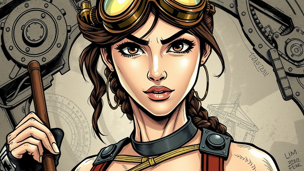Steampunk-inspired portrait of Lara Croft, rendered in a detailed comic style reminiscent of Jim Lee, blending elements of 3D, cartoon, and anime aesthetics. The image features intricate gear-adorned attire, vintage goggles, and a Victorian-era adventure setting. Lara's iconic confident pose and expressive features are highlighted through dynamic sketches, capturing the adventurous essence of her character. The composition embraces a playful twist while staying true to her adventurous spirit, balancing complex details with vibrant energy.