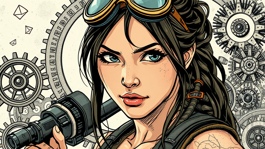 Steampunk-inspired portrait of Lara Croft, rendered in a detailed comic style reminiscent of Jim Lee, featuring a mix of 3D and cartoon aesthetics with anime influences. The portrait includes intricate sketches showcasing her iconic adventurous persona, enhanced by a steampunk twist with gears, goggles, and Victorian-era attire. The overall visual maintains a slightly edgy, low-resolution finish, conveying a dynamic and adventurous energy, while a backdrop of cogs and steam machines sets the scene.